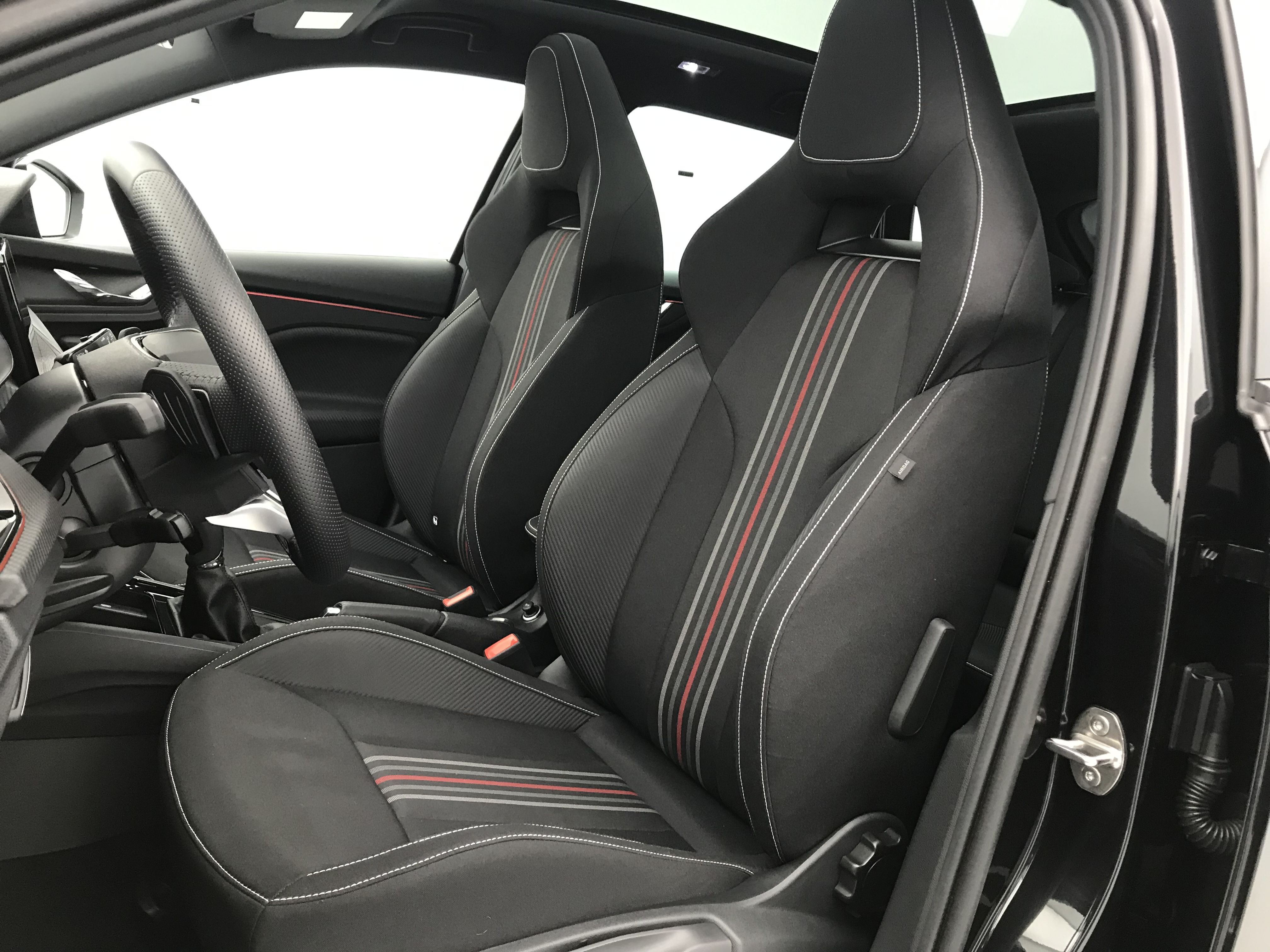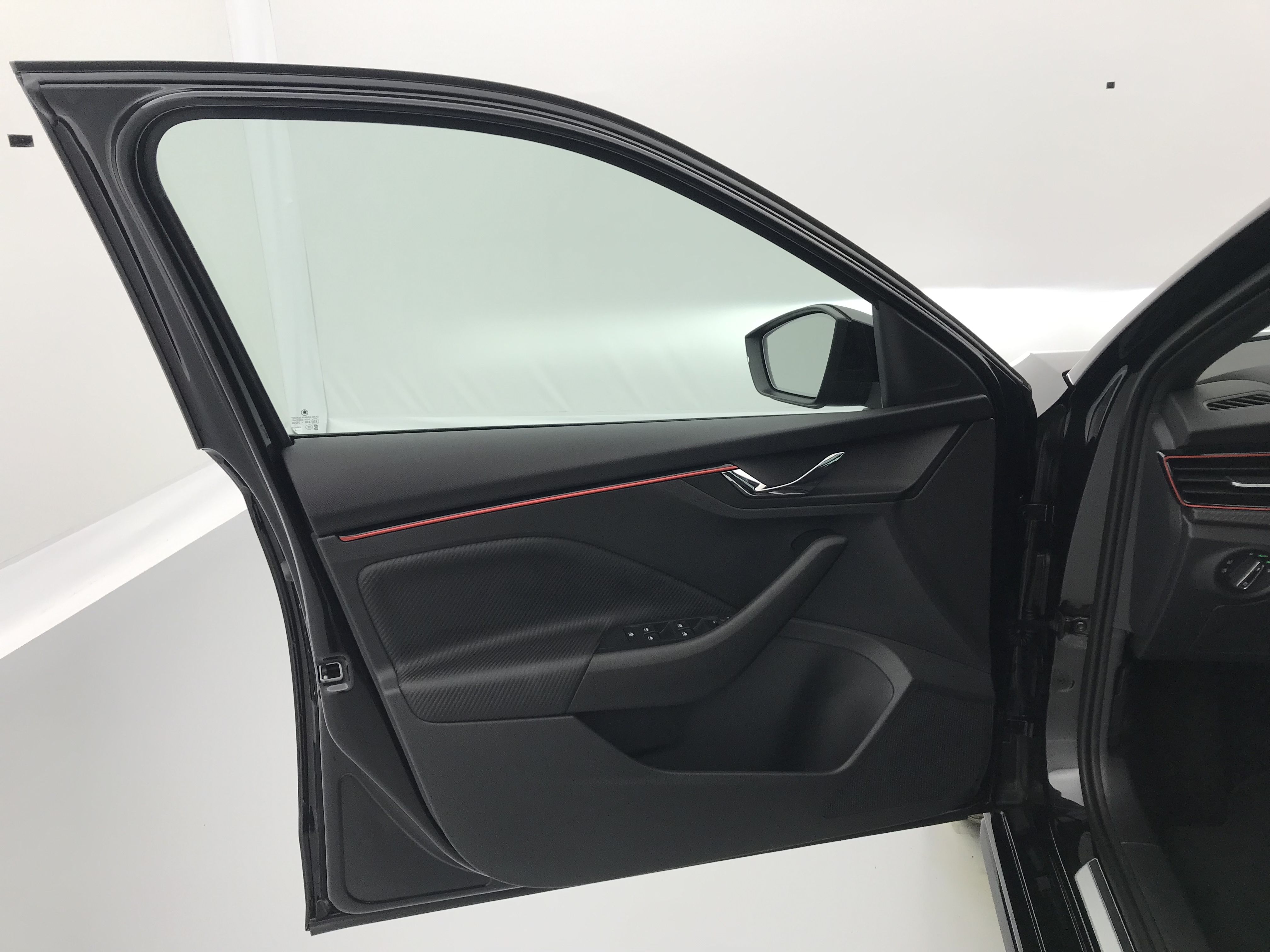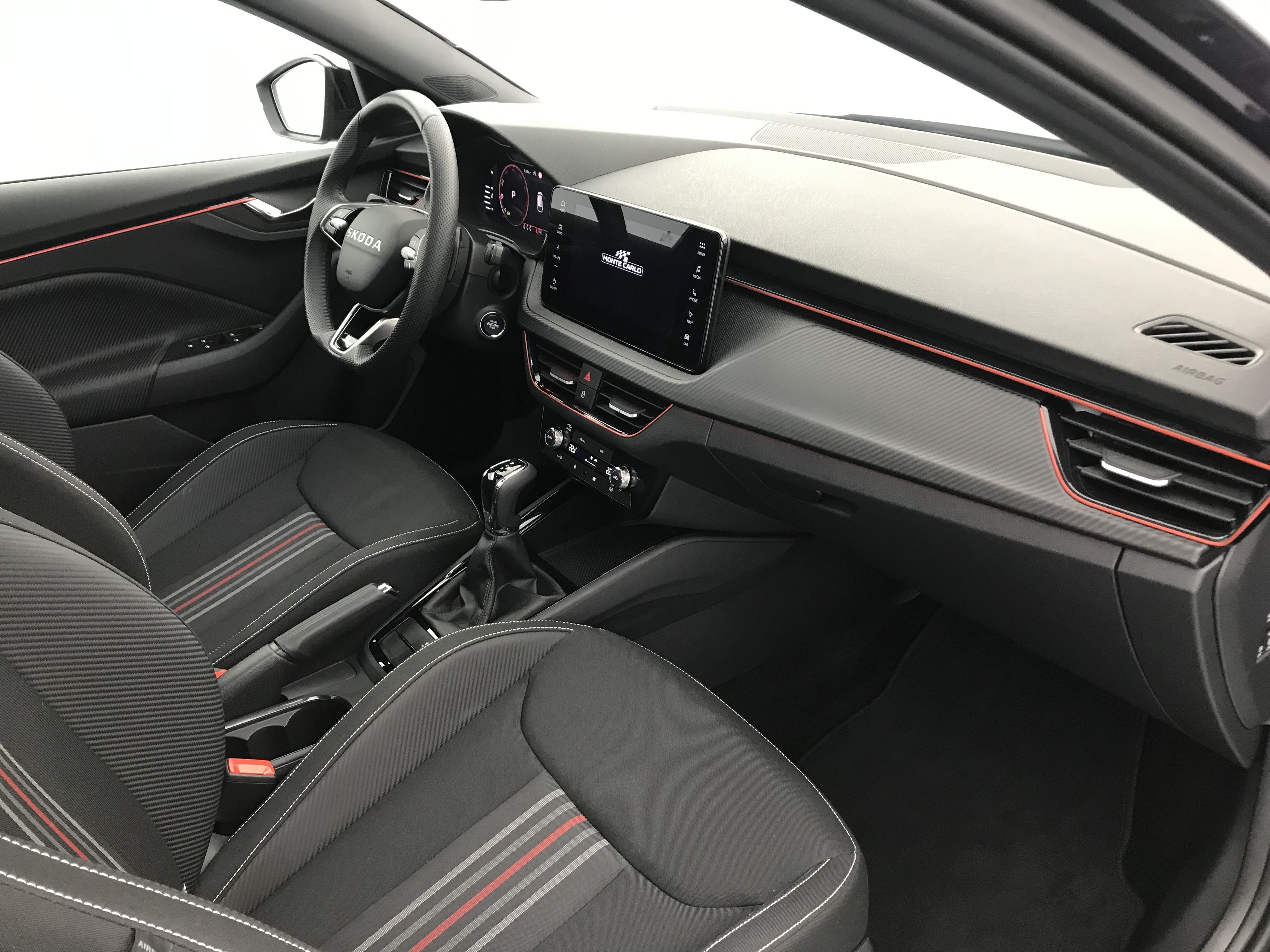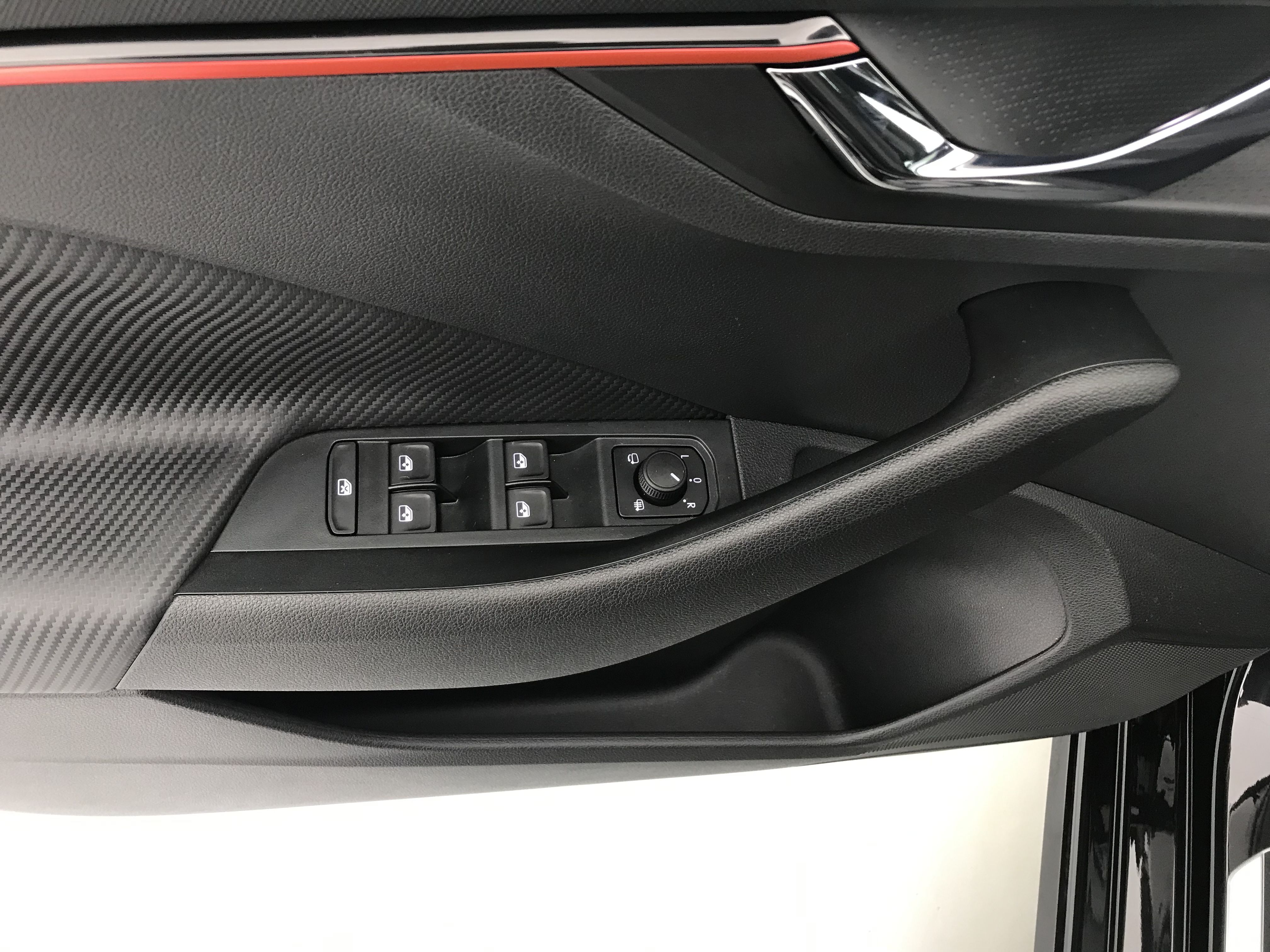 - Insert décoratif sur la planche de bord effet Carbone avec liseré rouge et inserts de porte matériau synthétique effet carbone