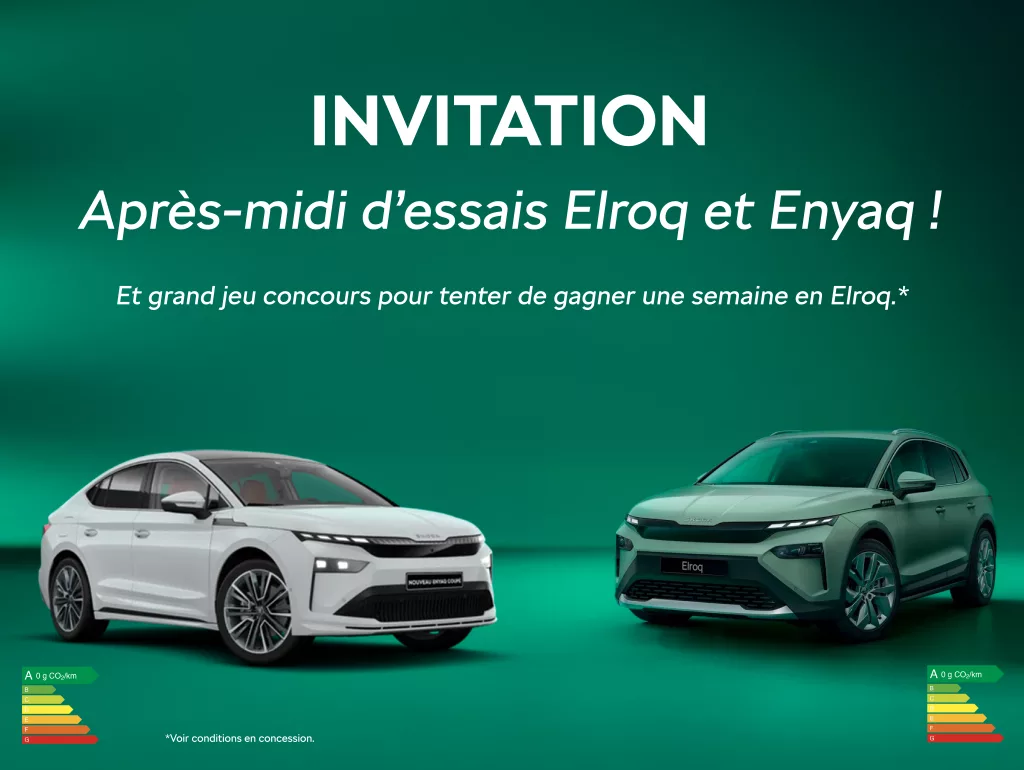 C’est avec plaisir que nous vous invitons à venir essayer les nouveaux Skoda Elroq et Enyaq, le samedi 26 avril de 14h00 à 17h00.