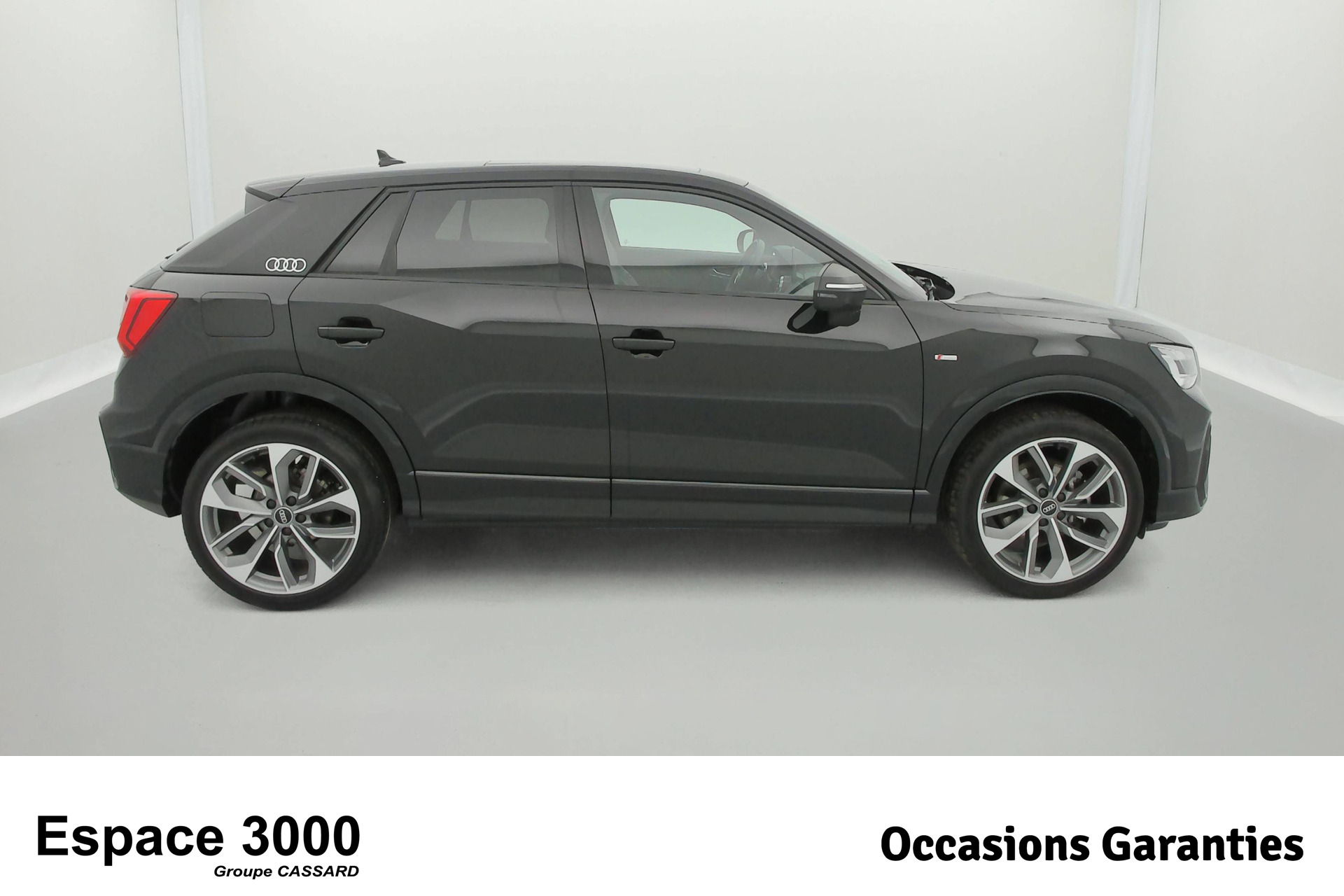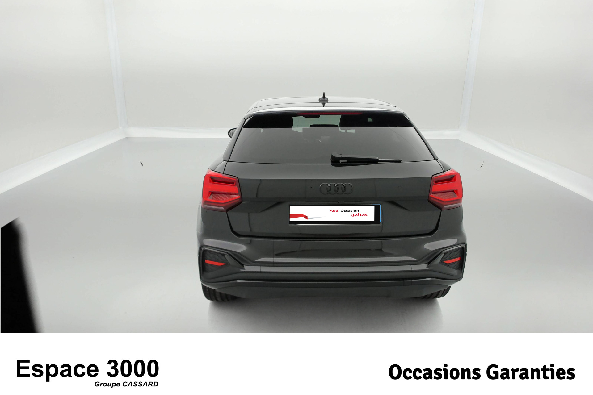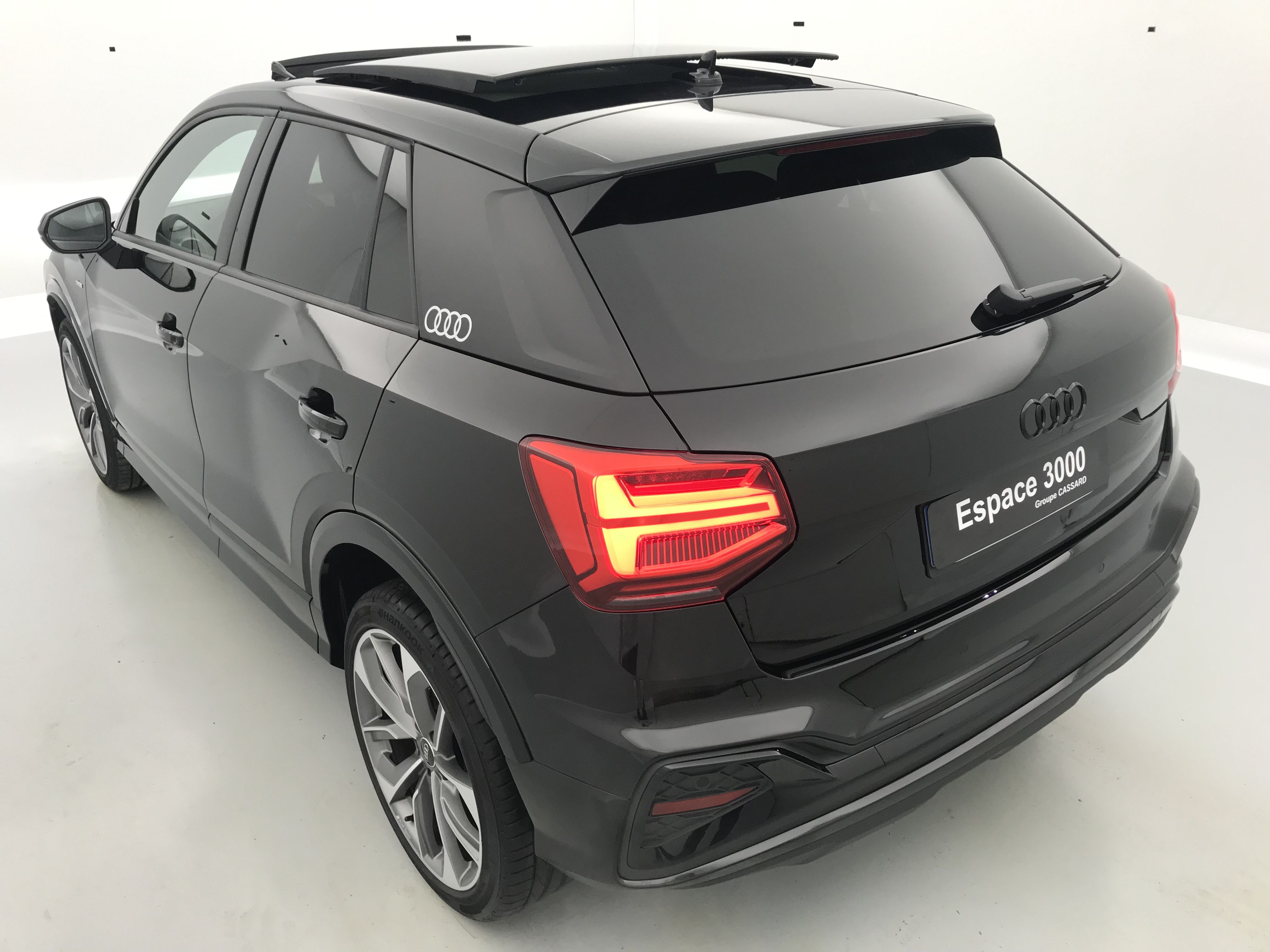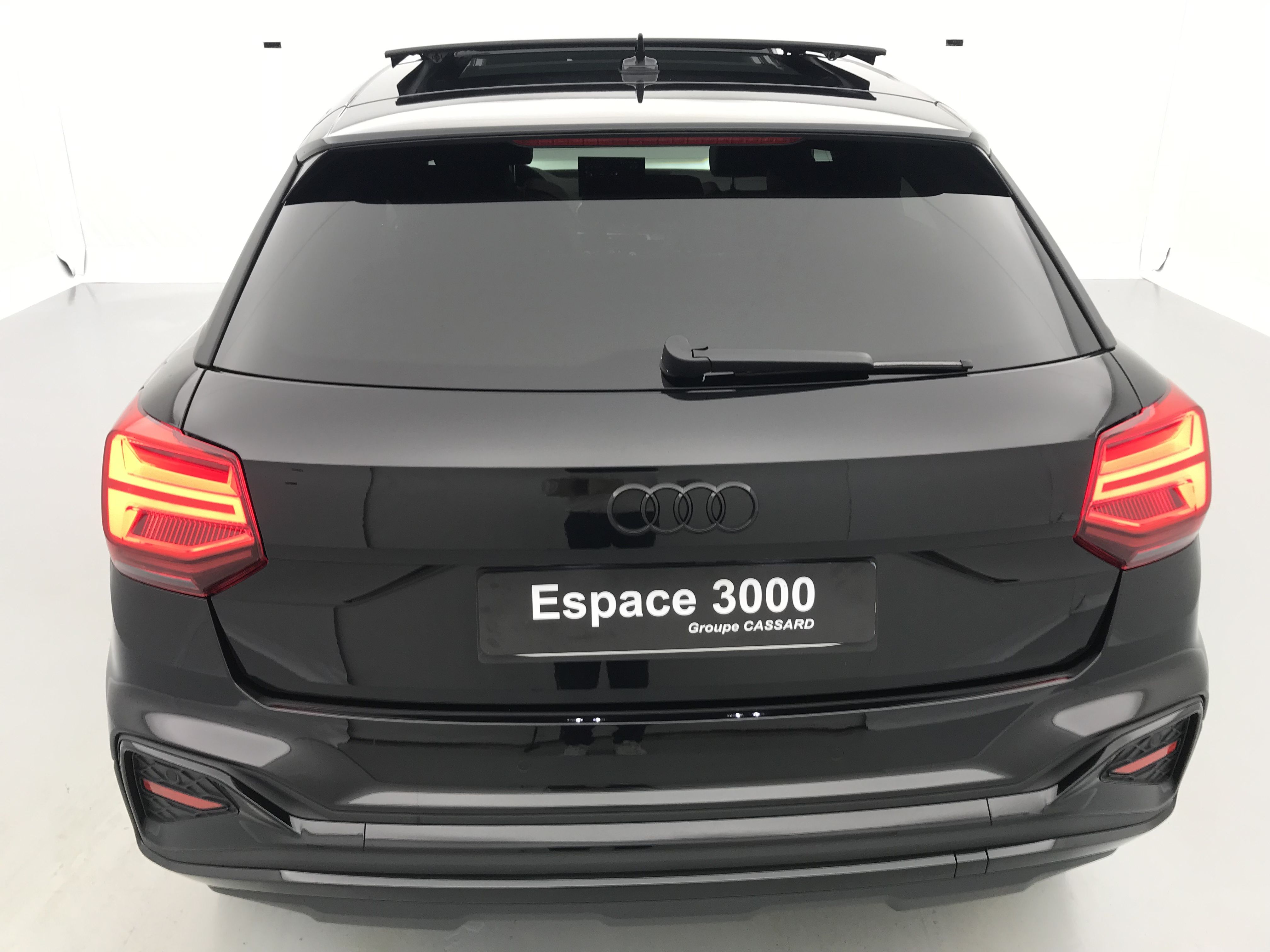 - Pack Esthétique Noir Plus Anneaux Audi en noir sur l'AV et l'AR du véhicule et identification du modèle/moteur en noir