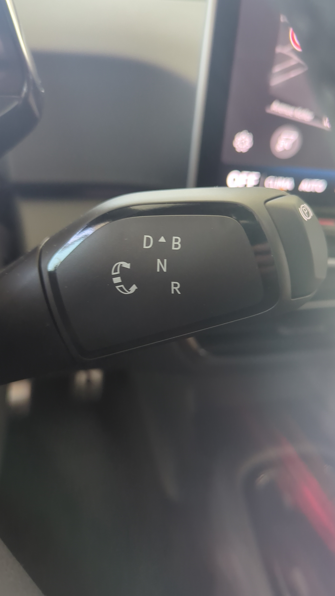 - Sélecteur de vitesse situé à droite derrière le volant avec frein de stationnement électronique Il dispose d'une marche AV (D/B)